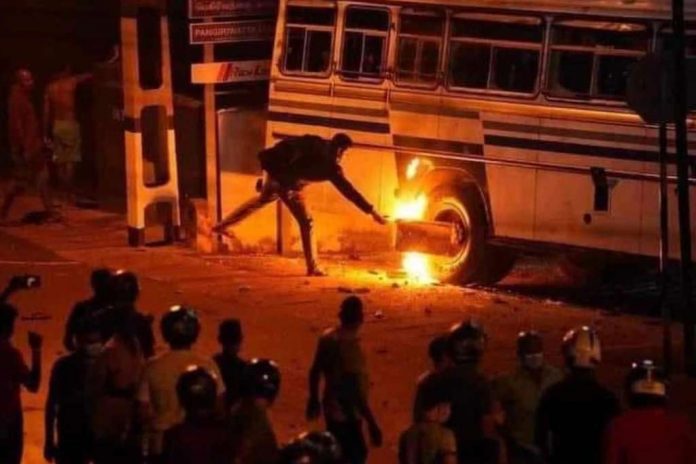 Police are seeking the public’s help to arrest two suspects in connection with arson attack on a bus and other vehicles during the protests near the President’s private residence in Mirihana Nugegoda on Thursday (March 31), in complete contradiction with the President’s Media Unit’s statement on the incident, claiming it to be committed by a group of ‘extremists’ looking for an ‘Arab Spring’ in Sri Lanka.