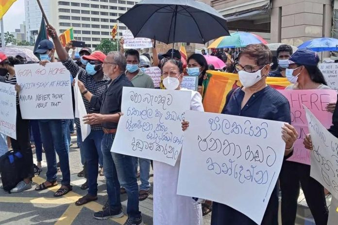 As the public protest demanding the stepping down of the President and the Government is continuing for the forth consecutive day today (12), Nanda Malini, the Sri Lankan Singing Legend, joined the demonstrators together with another Legend in Sri Lankan Music, lyricist Prof. Sunil Ariyaratne.