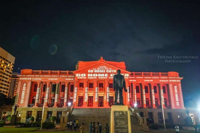 Digital projections of anti-government slogans and designs were displayed on the Presidential Secretariat building in a historic event as the public protest demanding the stepping down of President Rajapaksa and the government continues for the ninth consecutive day today (17).