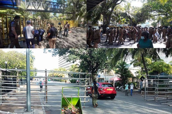Since this (24) morning the Police and the Military are responding to the march organised by the Inter-University Students’ Federation (IUSF) from Colombo Fort to the Galleface Grounds today in a rather bizarre manner by blocking many roads in Colombo Fort by setting up GI pipes.