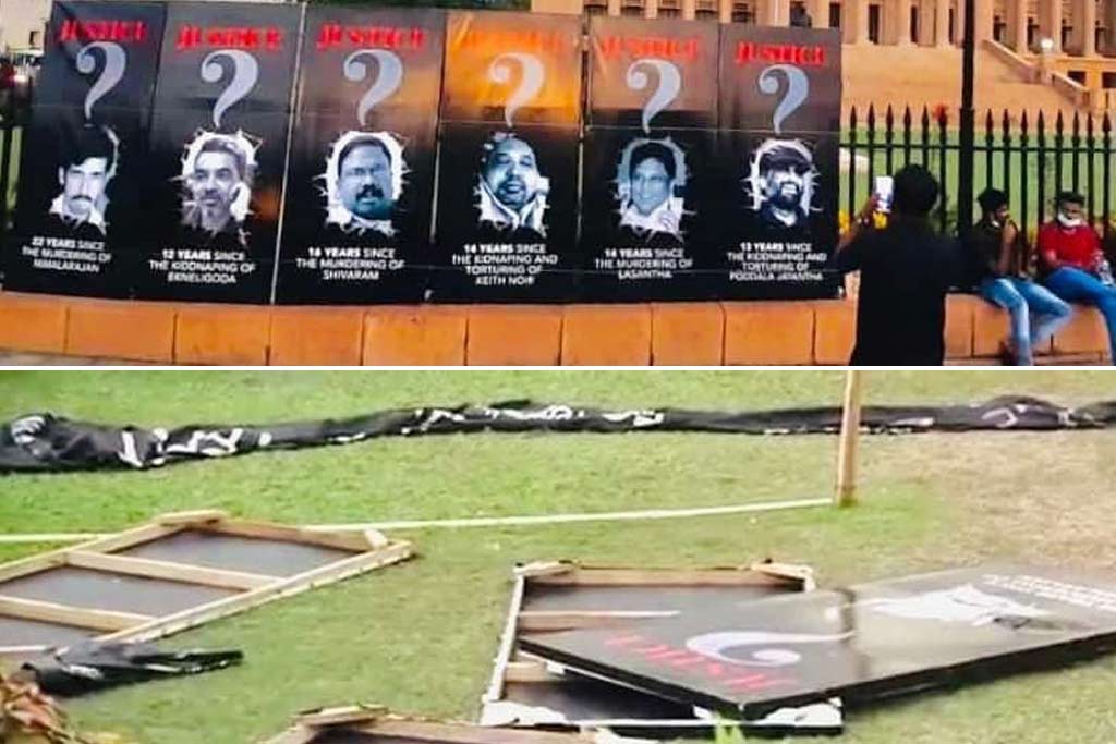 The posters included slain journalists Mailvanagam Nimalarajan, Lasantha Wickramatunga and Dharmaratnam Sivaram, abducted journalist Prageeth Ekneligoda and assaulted journalists Keith Noir and Poddala Jayantha and were thrown away on to the ground by two Police officers in plain clothes.